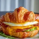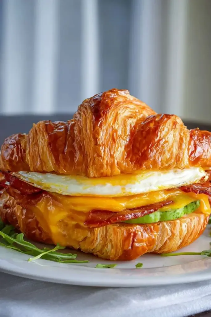 A warm and satisfying Croissant Breakfast Sandwich layered with creamy avocado, crispy bacon, fluffy scrambled eggs, and melty cheddar cheese—all nestled inside a buttery toasted croissant. Perfect for a hearty breakfast or weekend brunch.