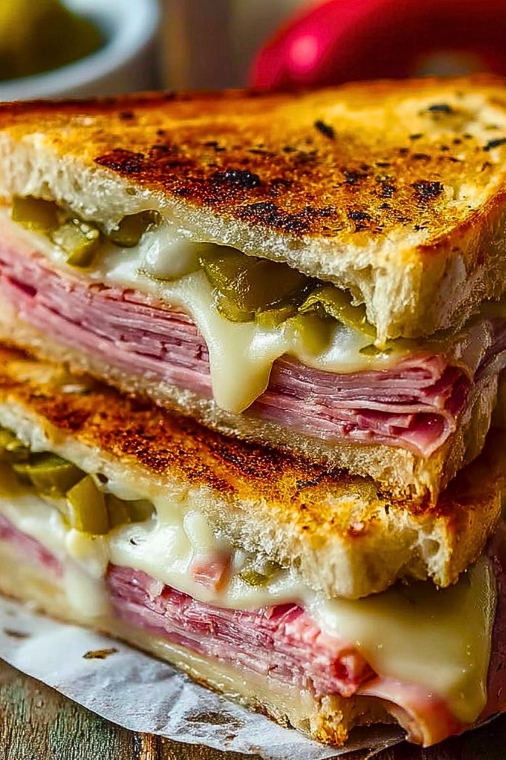 A Delicious Cuban Sandwich Cubano is a mouthwatering pressed sandwich layered with juicy ham, roasted pork, Swiss cheese, tangy pickles, and yellow mustard—all nestled between slices of crisp, buttery Cuban bread. Its perfectly grilled exterior and savory interior strike a delicious balance of textures and bold flavors that make every bite unforgettable.