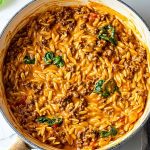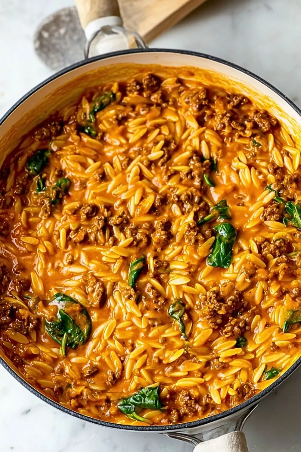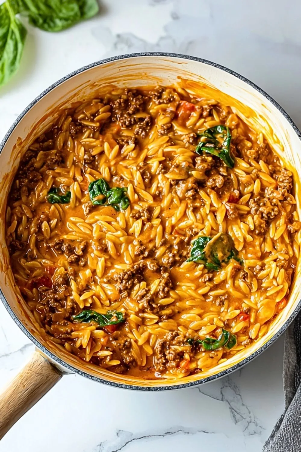 Keywords: ground beef recipes, creamy orzo, easy dinner, one pot recipe, quick weeknight meal