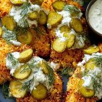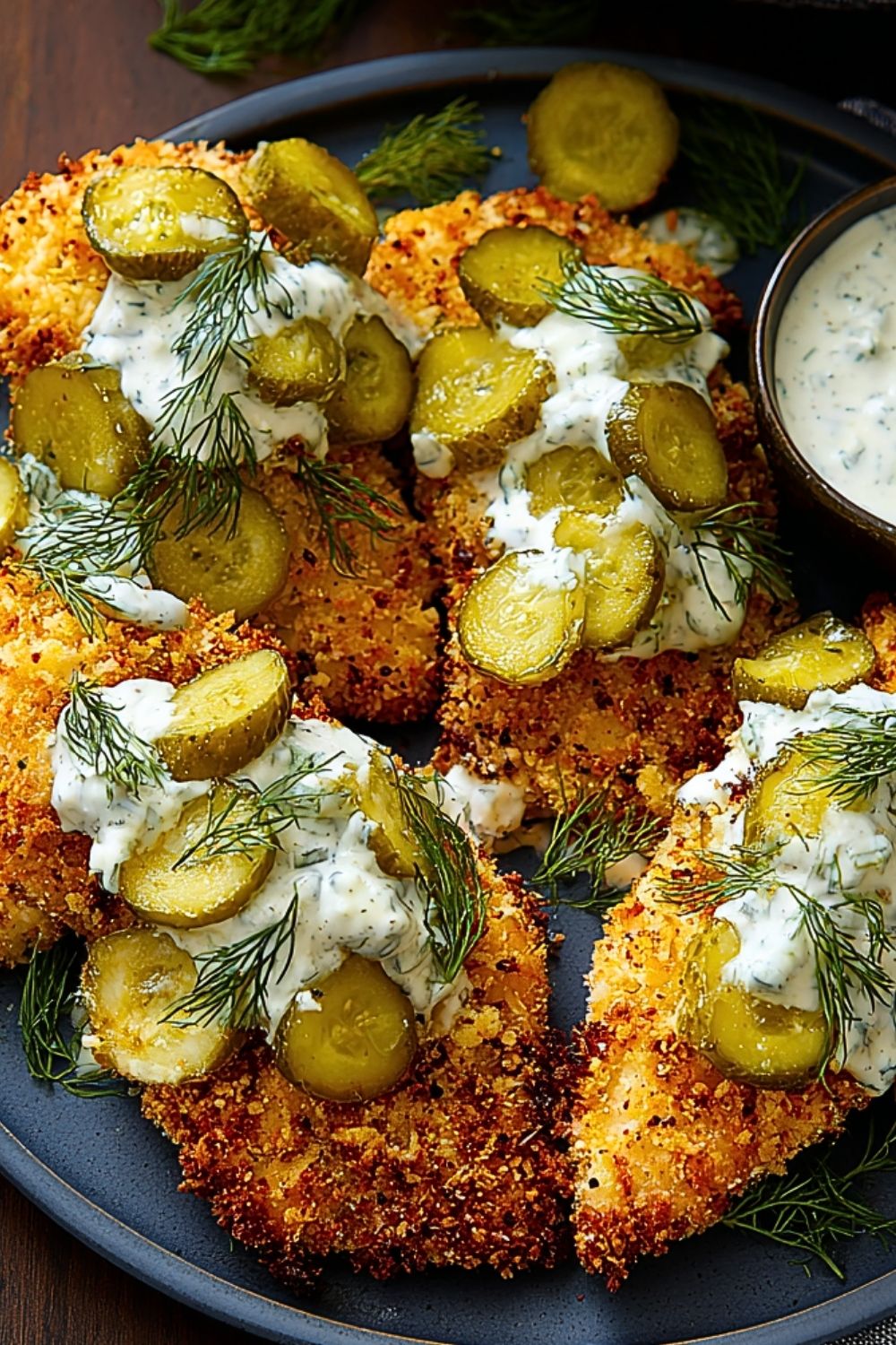 Crispy, juicy, and boldly flavorful, Dill Pickle Parmesan Chicken is a crave-worthy twist on traditional baked chicken. Marinated in tangy dill pickle juice, then coated in a crunchy Parmesan and panko crust, each bite is packed with a perfect balance of zest, salt, and richness. Topped with a creamy dill sauce and garnished with sliced pickles, this dish offers a surprisingly addictive harmony of textures and flavors.