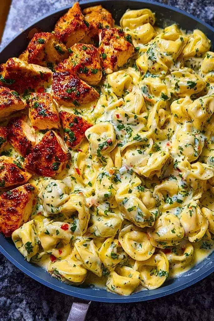 Keywords: easy dinner, one pot meal, cheesy tortellini, comfort food, quick dinner, food ideas, chicken pasta