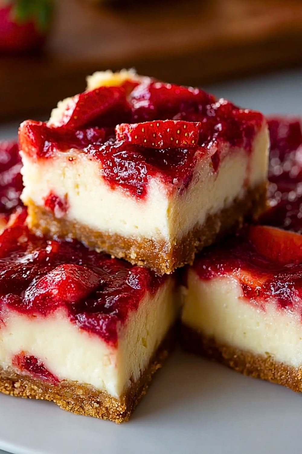 Make sure your cream cheese is at room temperature before mixing—it blends much smoother and prevents lumps. Use fresh or frozen strawberries for the swirl, but cook them down into a jam-like texture to concentrate the flavor and reduce moisture. Don’t overbake the cheesecake; the center should be slightly jiggly when you remove it from the oven. Let it cool completely, then refrigerate for a few hours (or overnight) before slicing for clean, perfect bars.