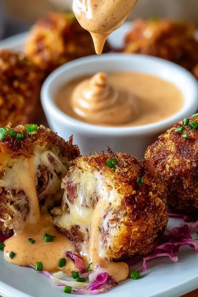 9. Serve the Reuben Balls hot with the spicy Thousand Island dip on the side.