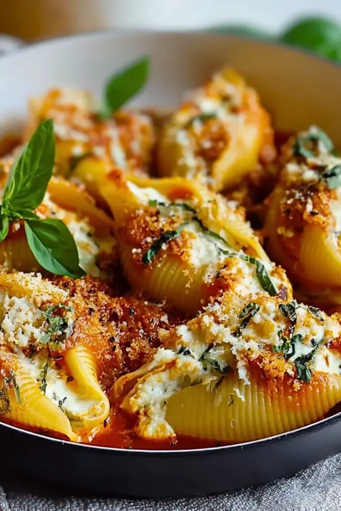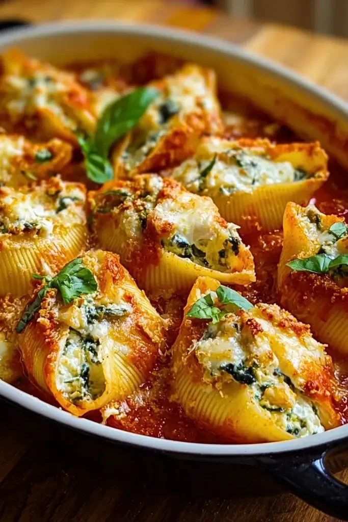 Tender pasta shells filled with creamy ricotta cheese, fresh spinach, and fragrant basil, all baked in a zesty marinara sauce and topped with bubbling mozzarella and parmesan. This comforting dish is perfect for family dinners, meal prep, or impressing guests with minimal effort.