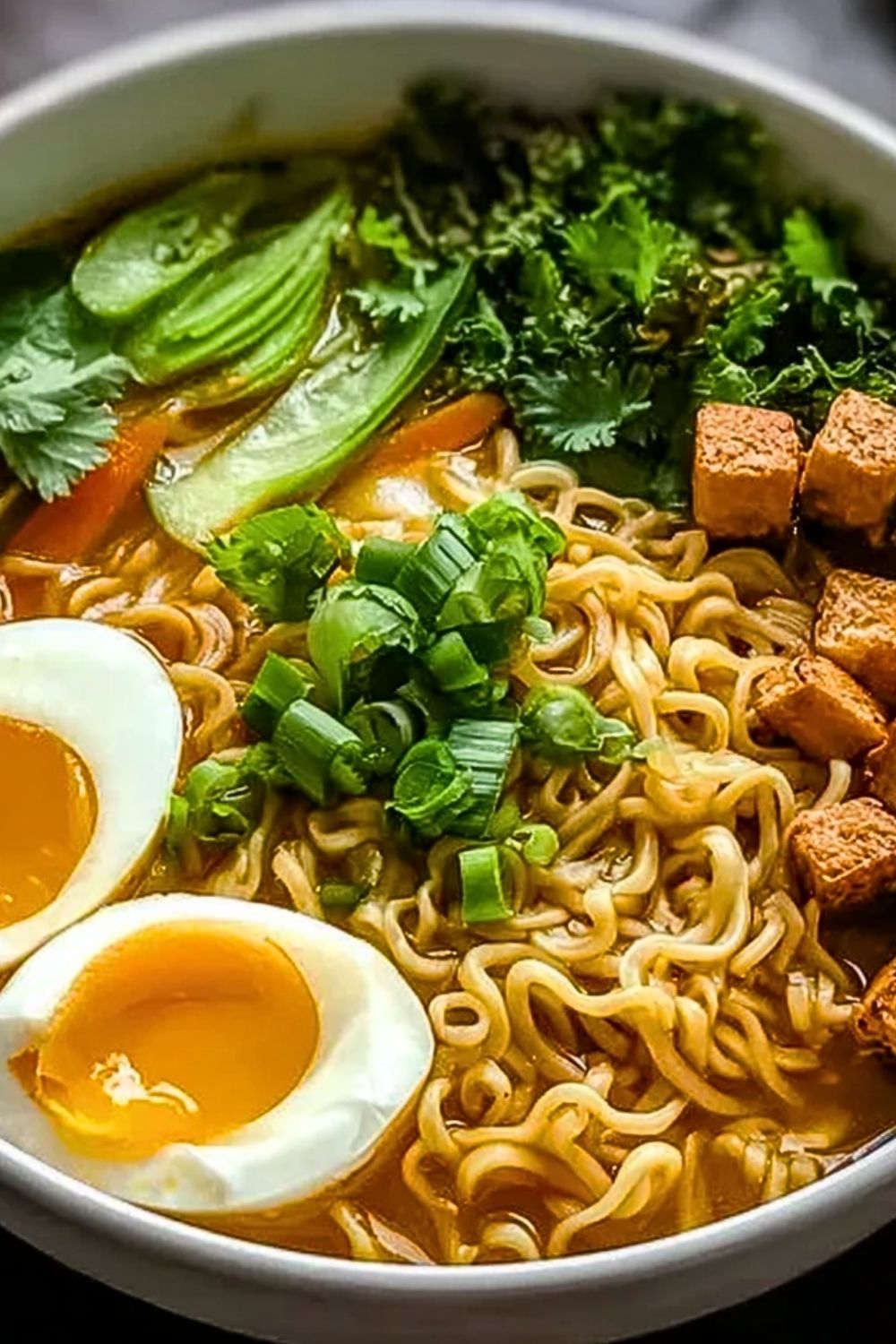 Divide the cooked noodles between serving bowls. Ladle the hot broth and vegetables over the noodles. Add the crispy tofu on top, followed by the halved soft-boiled eggs if using. Garnish with sliced green onions, cilantro, and a drizzle of chili oil or sriracha if desired.