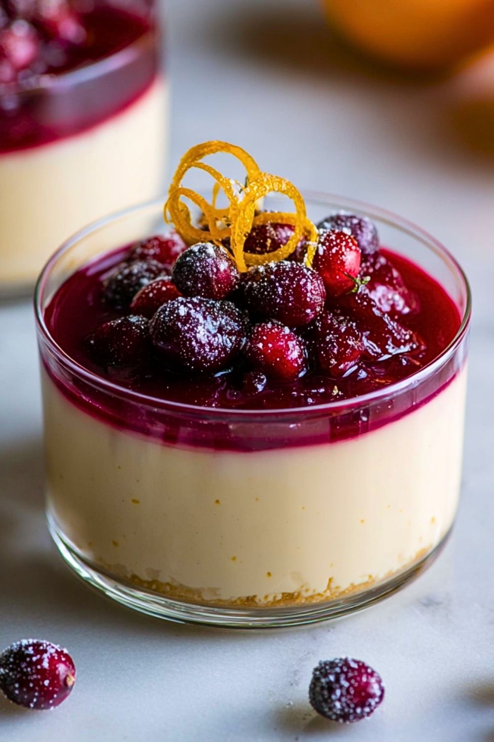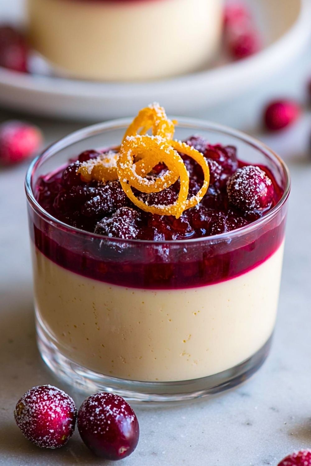Once the panna cotta is fully set and the cranberry sauce is cool, spoon a layer of cranberry sauce over each panna cotta. Garnish with orange zest curls or sugared cranberries if desired. Serve chilled and enjoy!