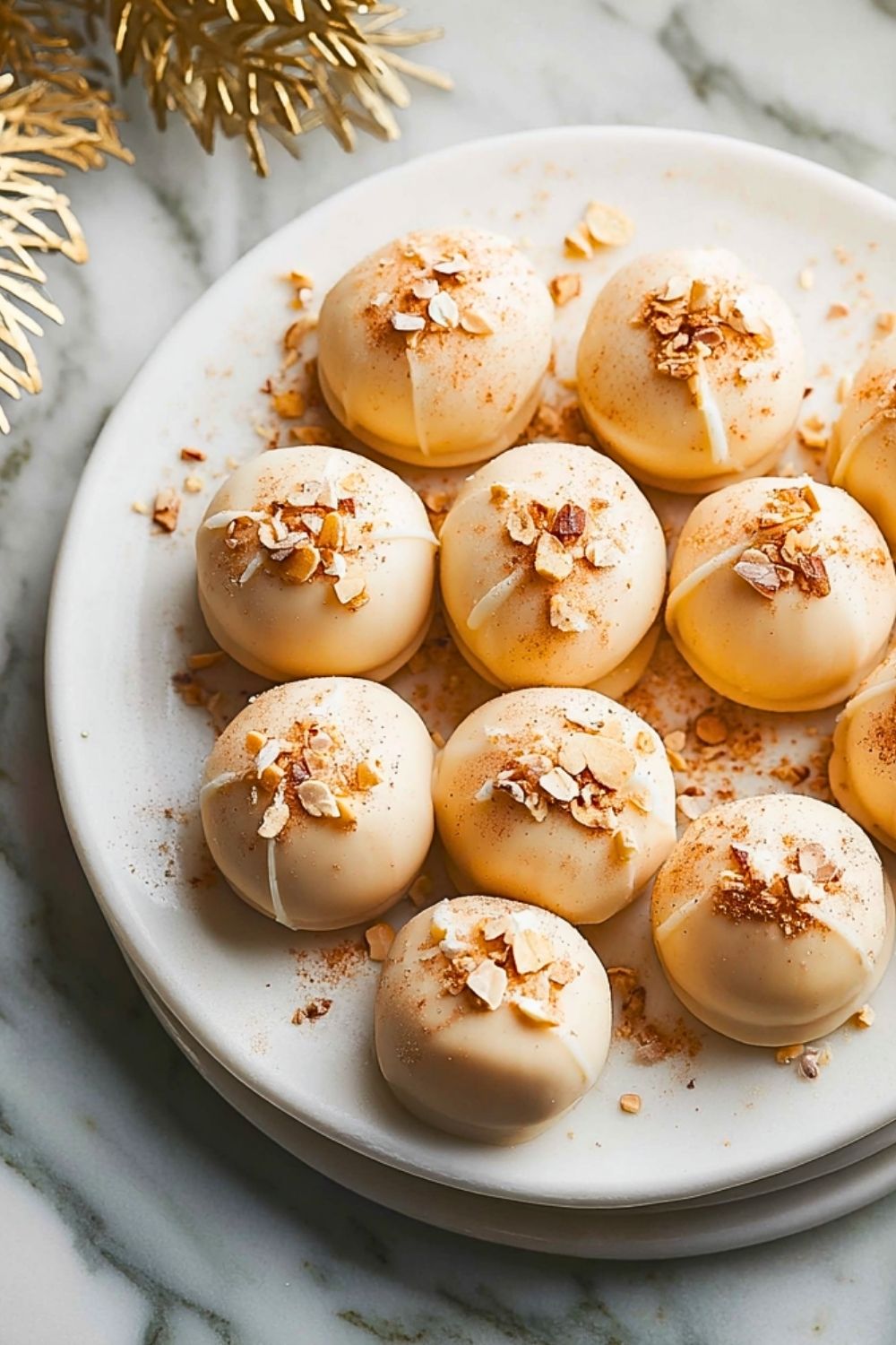 Keywords: eggnog truffles, holiday treats, no bake dessert, white chocolate truffles, easy Christmas candy