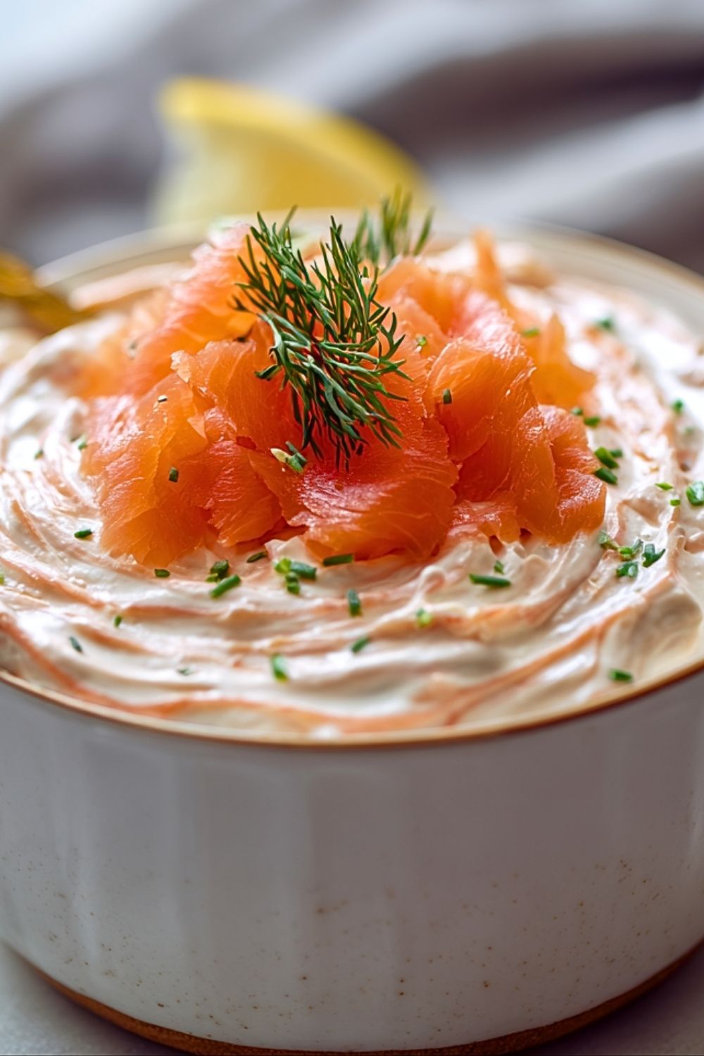 Right before serving, garnish with small strips of smoked salmon and a sprig of dill for an elegant touch. Serve with crackers, crostini, or cucumber slices.