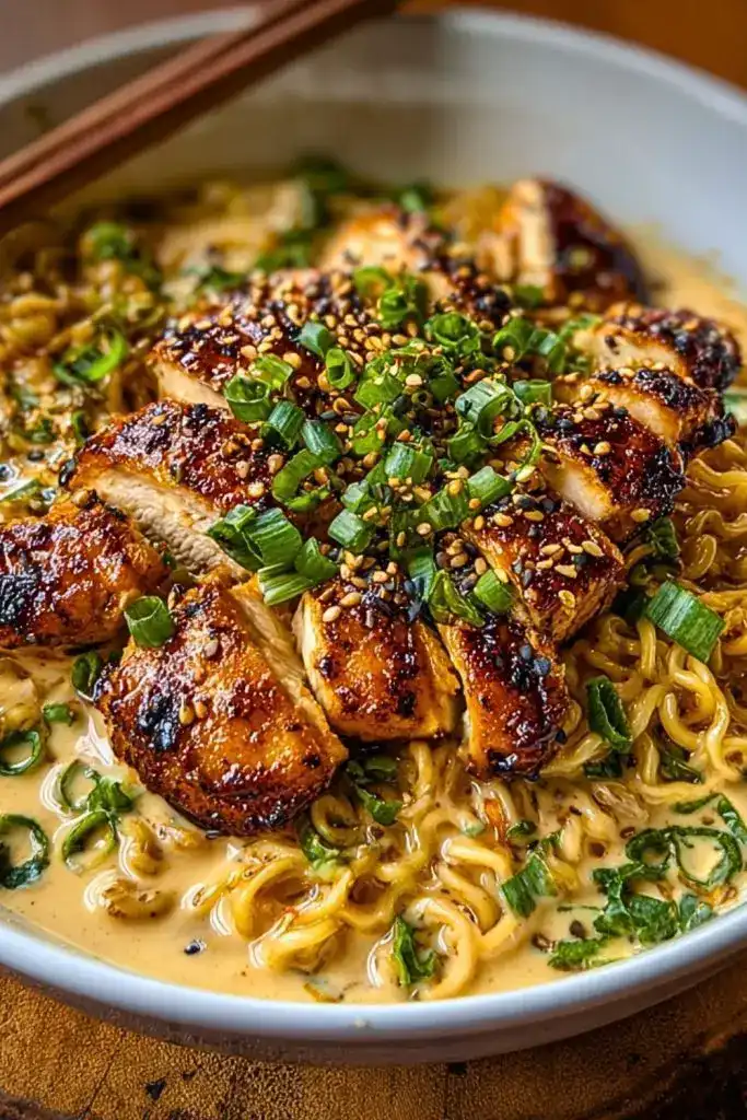 Assemble by placing ramen noodles in a bowl, topping with creamy sauce and sliced chicken. Garnish with green onions.