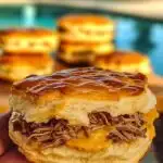 Serve the biscuits warm with a side of au jus for dipping. The flaky, buttery biscuit combined with juicy beef and melty cheese creates the perfect bite!