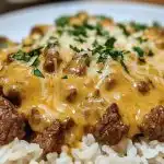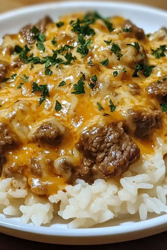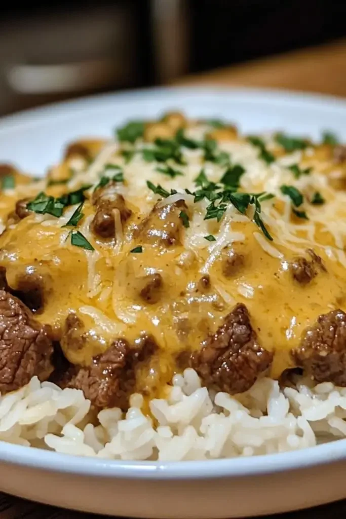 A comforting one-skillet meal featuring tender garlic butter beef served over fluffy rice and smothered in a creamy cheddar-parmesan sauce. Rich, hearty, and packed with flavor, it’s the perfect quick dinner for any night of the week.