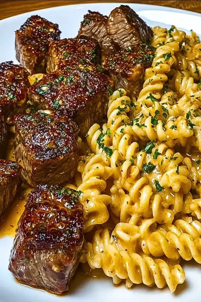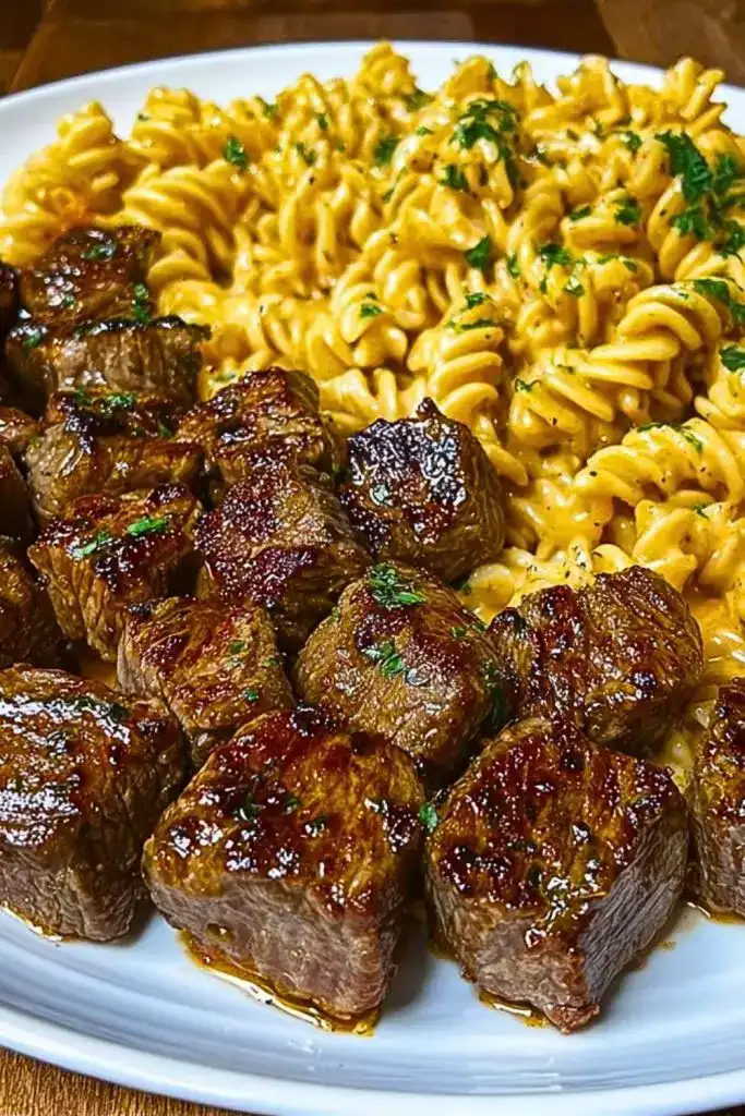 10. Plate the pasta, top with steak bites, and garnish with fresh parsley and extra Parmesan if desired.