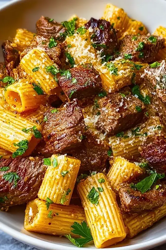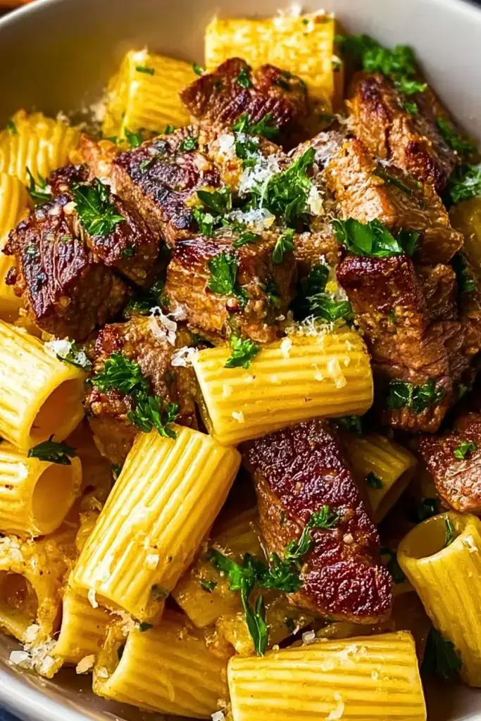 Return the seared steak cubes to the pan, gently tossing them into the pasta. Let them warm through for about 1–2 minutes. Taste and adjust seasoning with additional salt, pepper, or parmesan if needed.