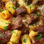 Picture this: tender, juicy cubes of steak seared to perfection, nestled among al dente rigatoni pasta, all coated in a luscious, savory garlic butter sauce. This Garlic Butter Steak Parmesan Rigatoni is pure comfort food at its finest—rich, hearty, and packed with bold flavors that feel both luxurious and soul-warming. Every bite melts in your mouth with the creamy parmesan backdrop and the satisfying chew of pasta.