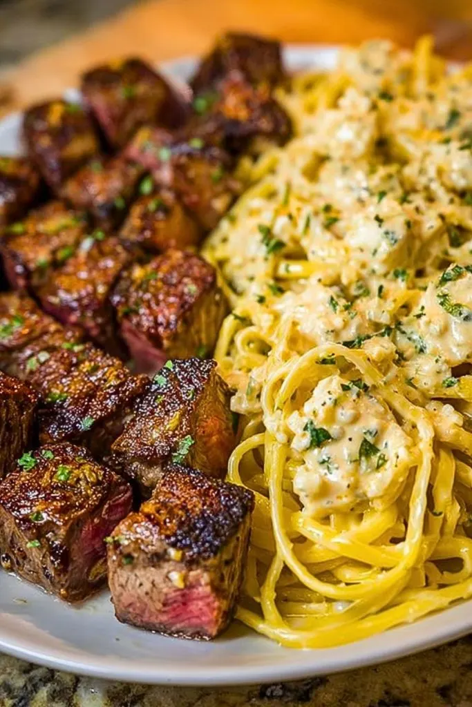 When tender, seared steak bites meet a luscious, velvety bed of cheesy linguine drenched in a four-cheese sauce, you know you’re in for something truly indulgent. This dish brings restaurant-level comfort straight to your kitchen. Each steak cube is pan-seared to perfection in garlic butter, delivering a rich, savory crust and juicy center, while the linguine is coated in a creamy blend of parmesan, mozzarella, fontina, and Romano for that bold and buttery flavor.