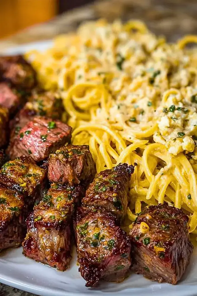 On a large serving platter or individual plates, serve garlic butter steak bites alongside the cheesy linguine. Garnish with chopped parsley and freshly cracked pepper.
