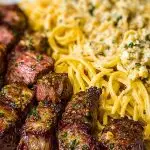 On a large serving platter or individual plates, serve garlic butter steak bites alongside the cheesy linguine. Garnish with chopped parsley and freshly cracked pepper.