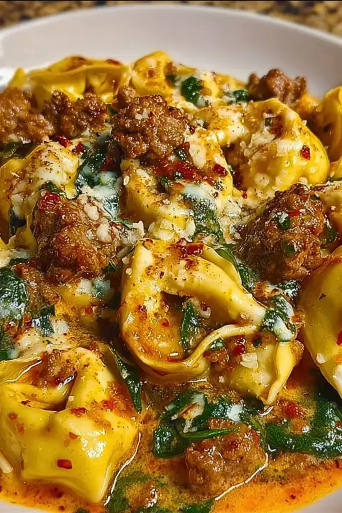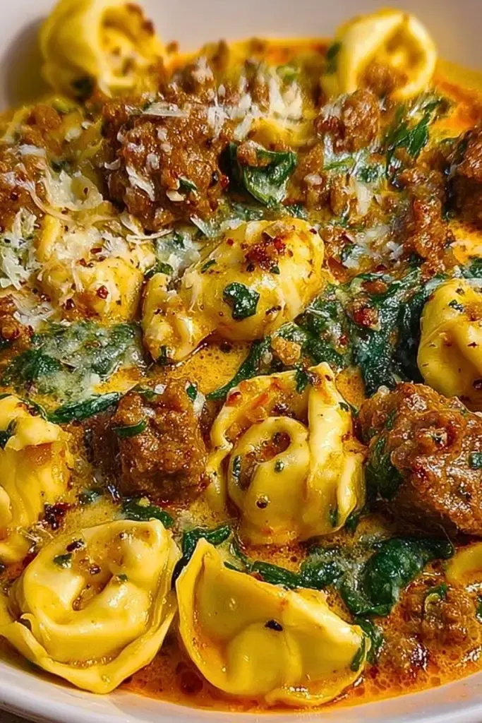 Garlic Butter Tortellini in Creamy Sauce with Beef, Italian Sausage & Spinach