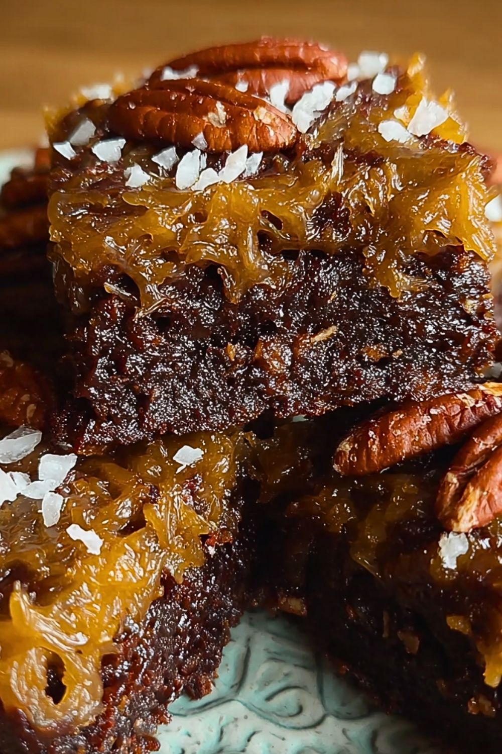 Spread the warm topping evenly over the cooled brownies. For an extra indulgent touch, drizzle with melted chocolate and top with additional pecans and a sprinkle of flaky sea salt.