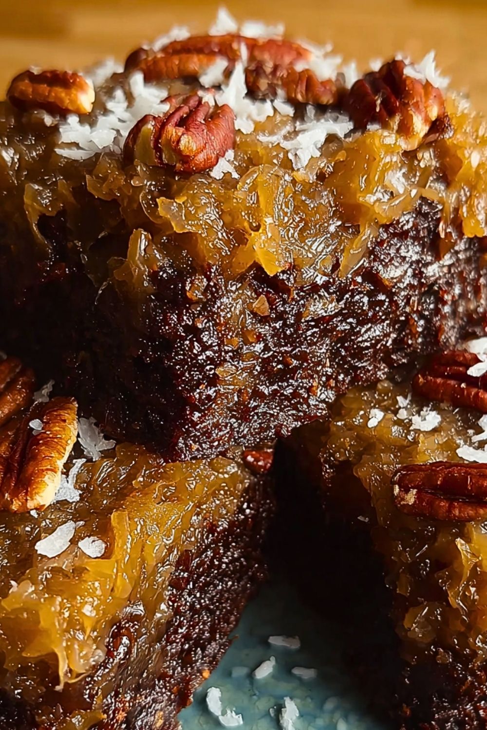 Keywords: german chocolate brownies, easy dessert, coconut pecan topping, chocolate snack, fudgy brownies