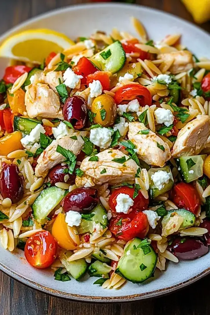 This Greek Chicken Orzo Salad is a fresh, vibrant dish packed with juicy chicken, crisp veggies, briny olives, creamy feta, and tender orzo pasta—all tossed in a zesty lemon-oregano dressing. Perfect for meal prep, summer picnics, or a light yet satisfying meal anytime.