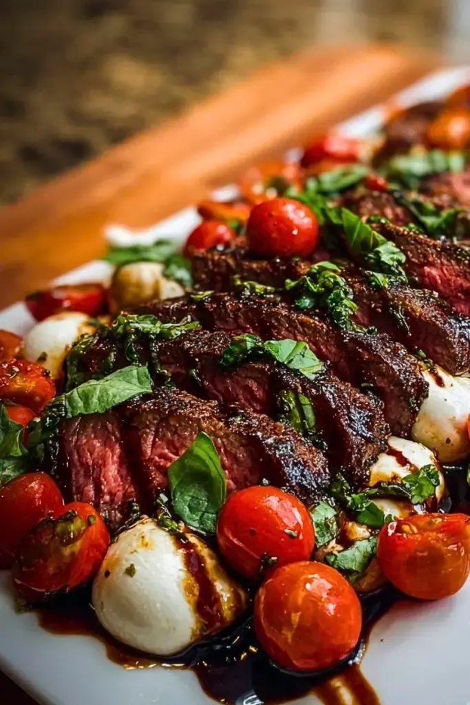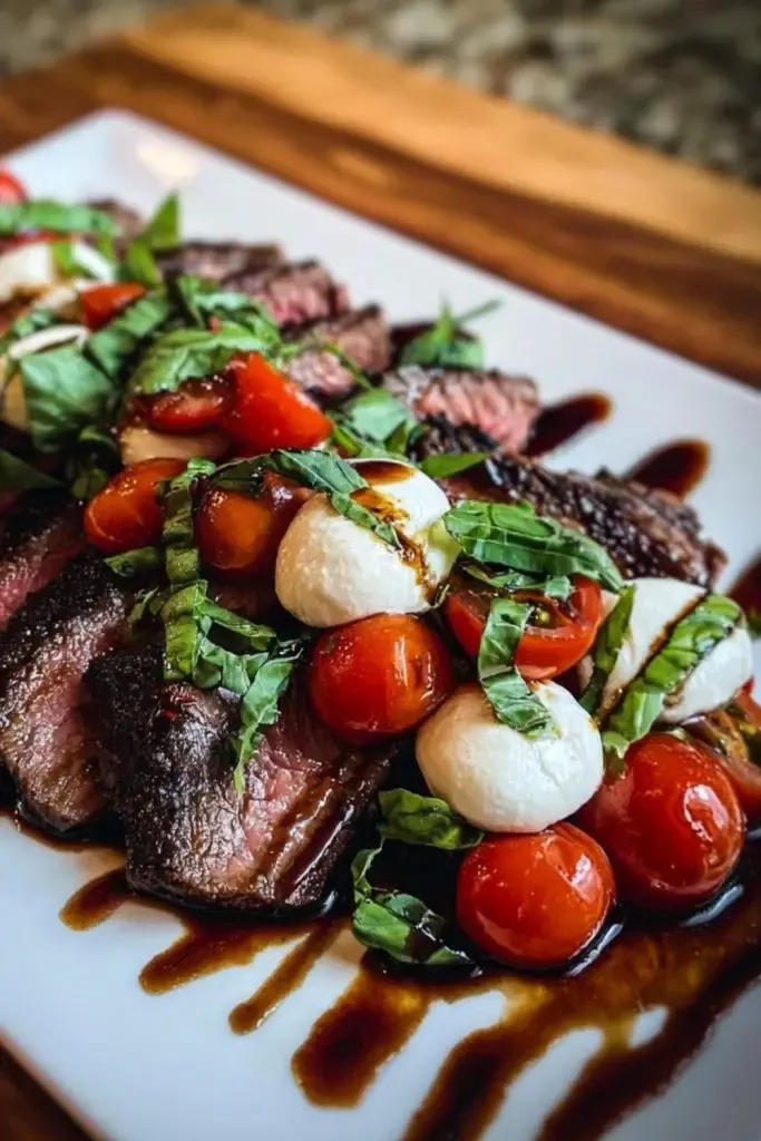 Arrange the steak slices on a serving platter. Spoon the tomato-mozzarella mixture generously over the top. Finish with a bold drizzle of balsamic glaze just before serving.