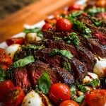 The seared steak is perfectly seasoned and grilled to your desired doneness, then topped with roasted cherry tomatoes, creamy mozzarella balls, ribbons of fresh basil, and a sweet, tangy balsamic glaze that ties it all together. This recipe is elegant enough to impress guests yet easy enough to make for a family meal. It’s truly one of those dishes that makes you pause between bites and say, “Wow.”