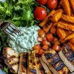 Grilled Chicken Power Bowl with Tzatziki and Sweet Potato Fries