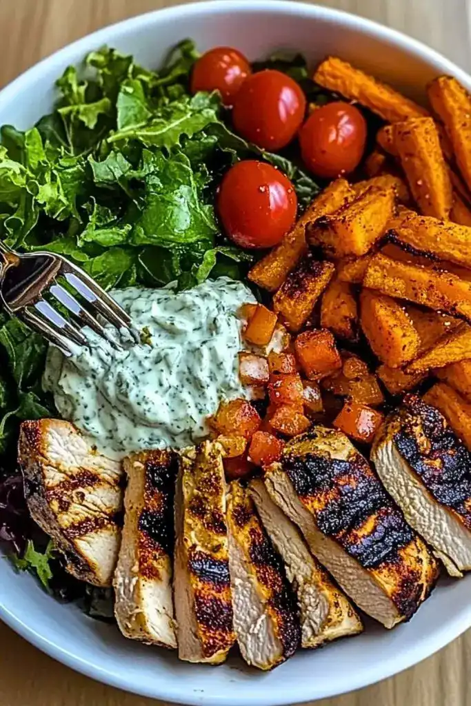 A colorful, nutritious dish that delivers both flavor and balance, the Grilled Chicken Power Bowl with Tzatziki and Sweet Potato Fries is a feast for the senses. Juicy grilled chicken breast is nestled alongside crisp greens, roasted sweet potato fries, and a refreshing scoop of homemade tzatziki. Sweet cherry tomatoes add a burst of brightness, while the creamy dip ties all the elements together in perfect harmony.