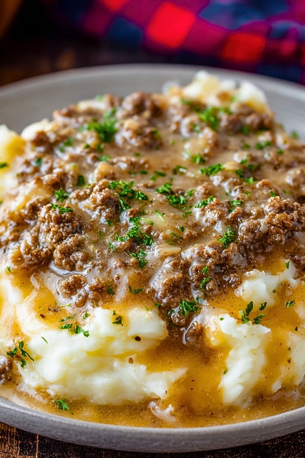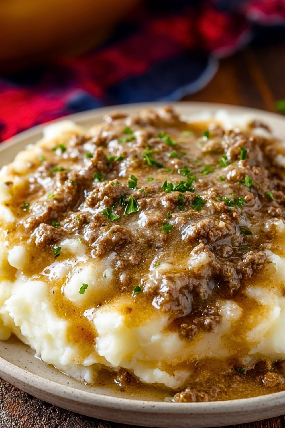 Spoon a generous amount of mashed potatoes onto each plate or bowl. Ladle the ground beef and gravy over the top. Garnish with chopped fresh parsley if desired. Serve hot and enjoy the comforting flavors!