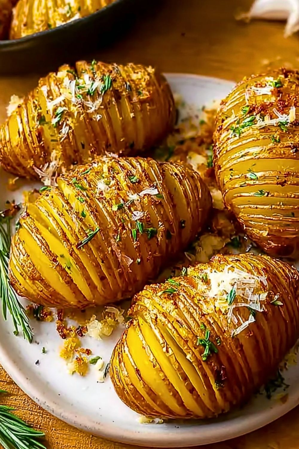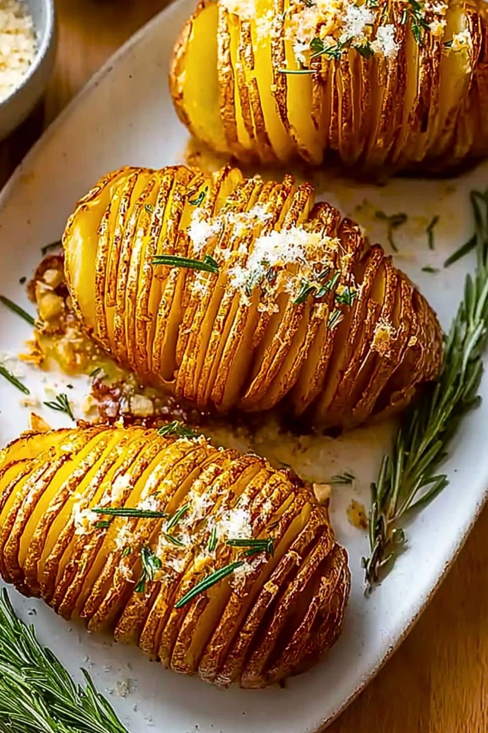 With their signature accordion-style slices, Hasselback Potatoes are a show-stopping side dish that looks gourmet but is surprisingly easy to prepare. Each potato is sliced thinly, almost all the way through, then roasted until the edges turn irresistibly crisp while the insides stay soft and fluffy. Bathed in garlic butter and garnished with fresh rosemary and flaky salt, they deliver both texture and flavor in every bite.