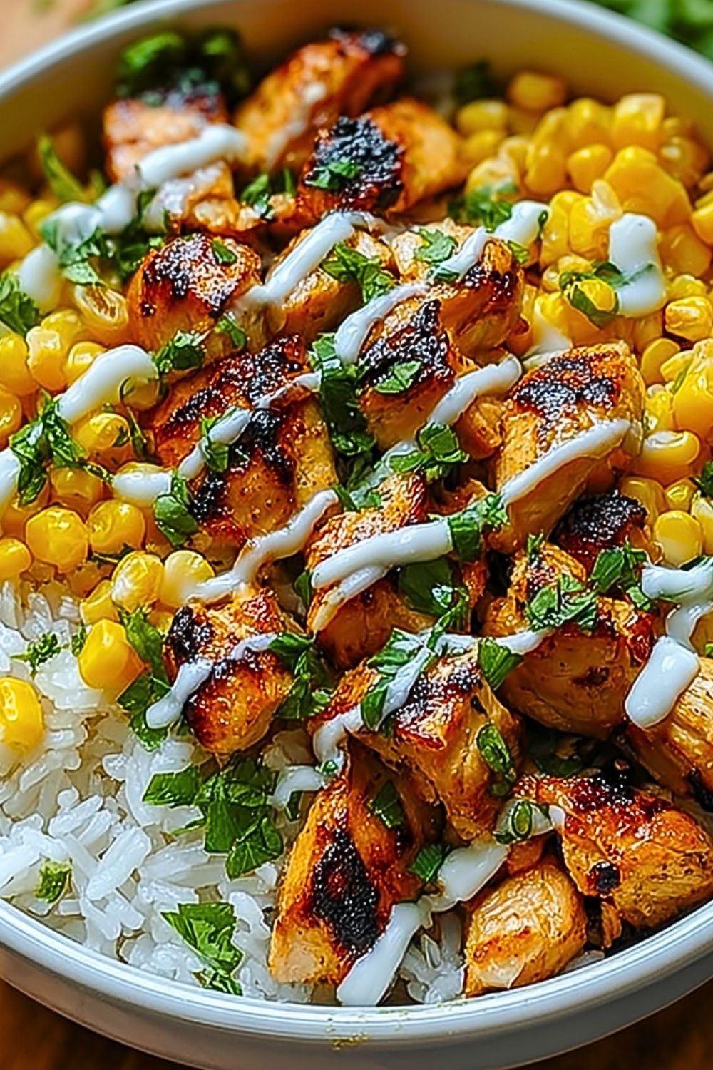 Juicy, golden-seared chicken pieces layered over fluffy rice and topped with sweet corn, fresh herbs, and a creamy drizzle—this bowl is the perfect balance of comfort and freshness. Every bite delivers a mix of smoky, savory flavors with a hint of natural sweetness, making it a satisfying meal you’ll want to come back to again and again.