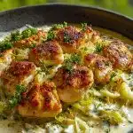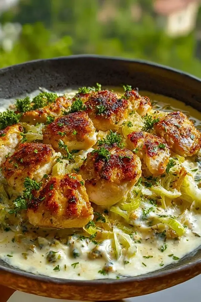 Golden, tender bites of herbed chicken rest in a luscious, velvety Alfredo sauce, made unforgettable with the earthy aroma of truffle and the tangy creaminess of feta. Each forkful melts into layers of indulgent flavor, balanced by the faint crunch and savory punch of crispy Parmesan-coated leeks. This isn’t just dinner — it’s a decadent, restaurant-level experience you can create at home.