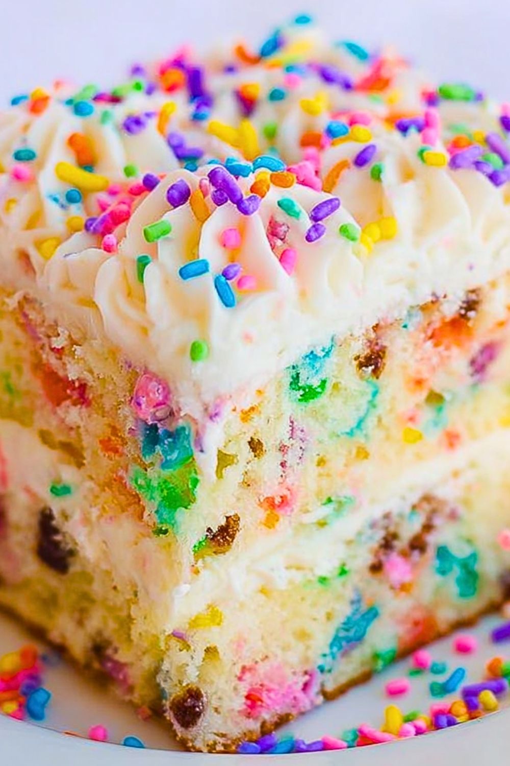 Cut the cake into squares or rectangles and serve. Each slice will reveal colorful bursts of sprinkles, making it as delightful to look at as it is to eat.