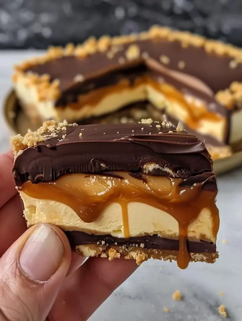 - Assembled Cheesecake – Once the caramel and chocolate layers are added, refrigerate for at least 4 hours or overnight to achieve the perfect set and easy slicing.