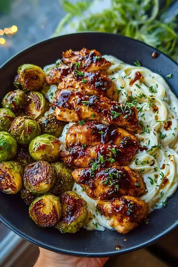 Whether you're cooking for guests or just feeding yourself, this dish delivers on every level. The chicken is seared to golden perfection, then finished in a glossy, sweet-and-spicy glaze. The Alfredo is creamy but not overpowering, thanks to the sharpness of whipped feta folded in. And the crispy Brussels chips? They add that finishing crunch and earthy bite that ties everything together. It's a satisfying mix of textures and bold flavors, all in one plate.