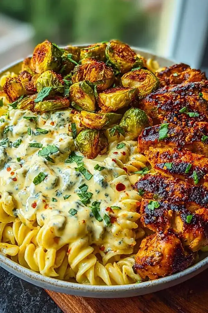 Get ready for a flavor-packed twist on classic Alfredo. Hot Honey Cajun Chicken Alfredo with Basil Feta Swirl & Crispy Brussels Chips is bold, creamy, spicy, and crunchy all in one dish. It’s a quick dinner idea with easy prep, featuring tender Cajun-spiced chicken glazed in hot honey, creamy feta and basil Alfredo sauce over rotini, and crispy roasted Brussels sprout chips for that perfect finishing crunch. Whether you're looking for a weeknight dinner, comfort food with a twist, or flavorful food ideas, this is a guaranteed hit.