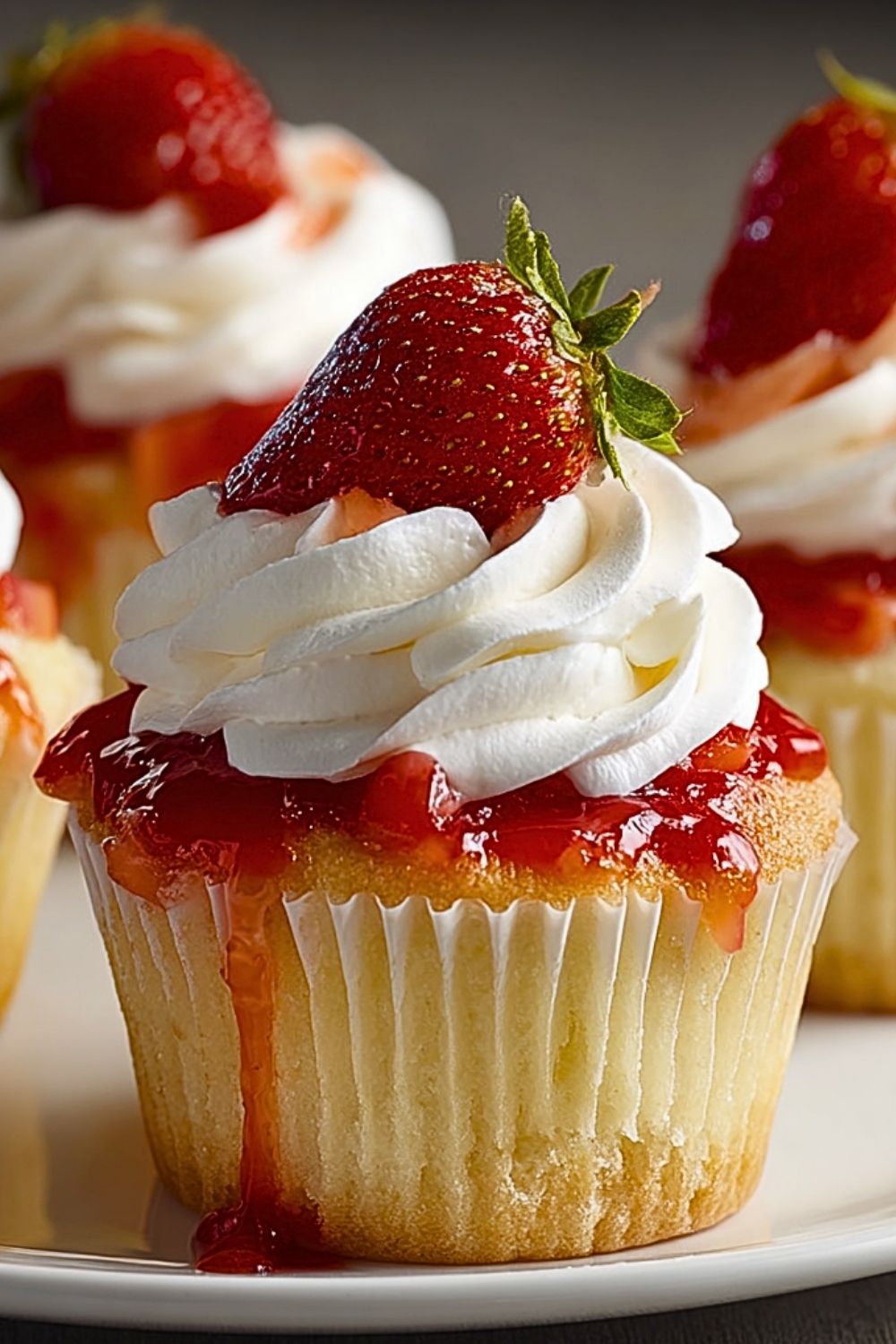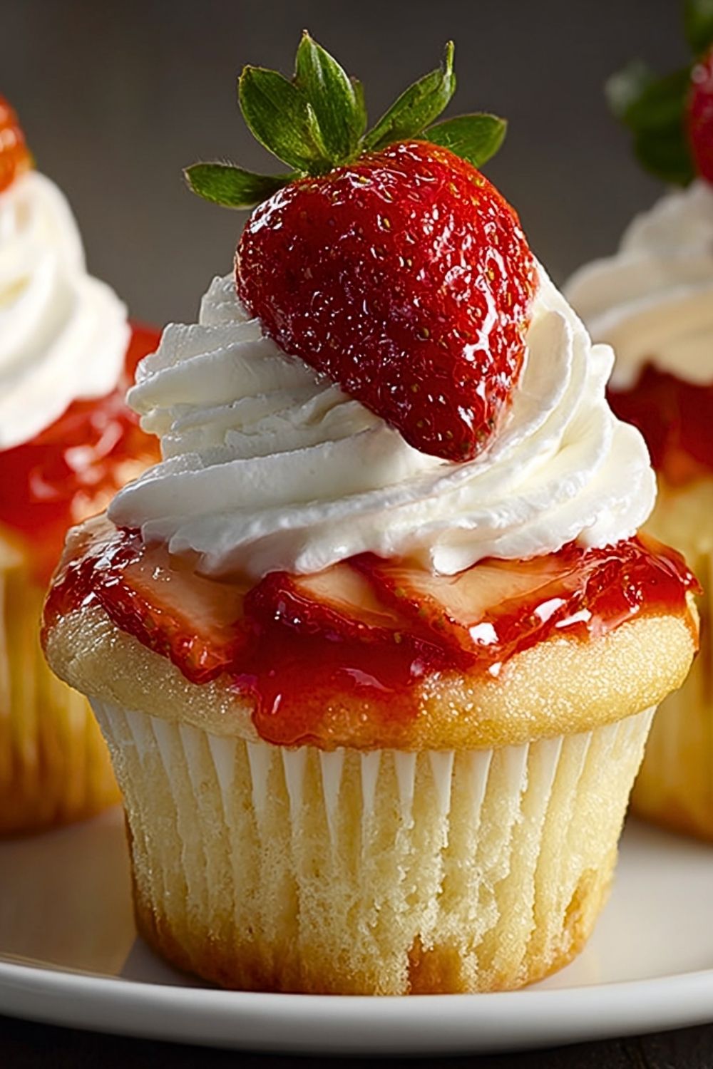 Pipe or spoon the whipped cream over each cupcake. Top with a dollop of strawberry filling or drizzle strawberry jam on top. Garnish with a whole strawberry for a beautiful finishing touch.
