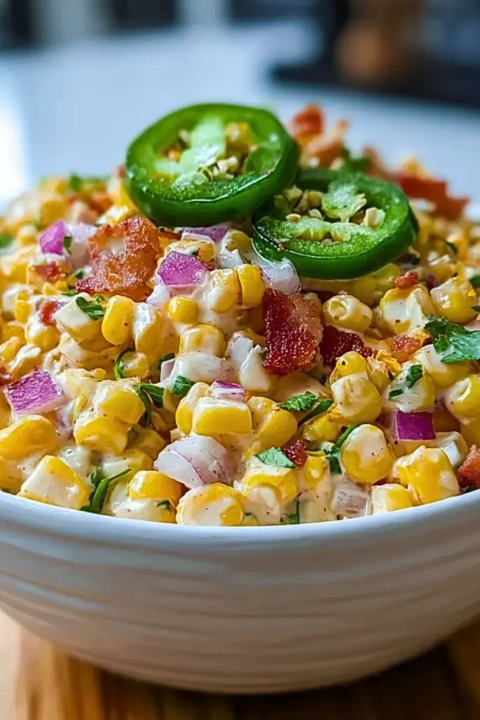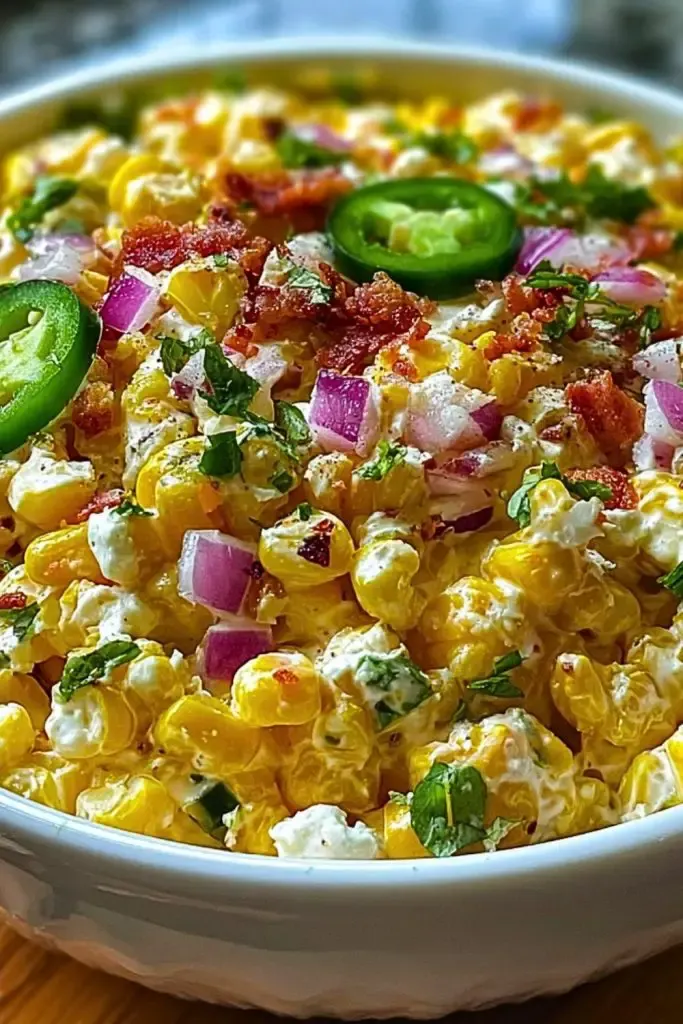 This isn’t your average corn salad. It’s bold, spicy, creamy, and smoky — all in one bowl. Whether you’re hosting a summer cookout or need a crowd-pleasing potluck dish, this salad delivers big flavor with minimal fuss. The creaminess from the cheese and mayo balances the heat of the jalapeños perfectly, while the bacon and onion add those sharp, savory edges. Plus, it’s easy to prep ahead and even better the next day.
