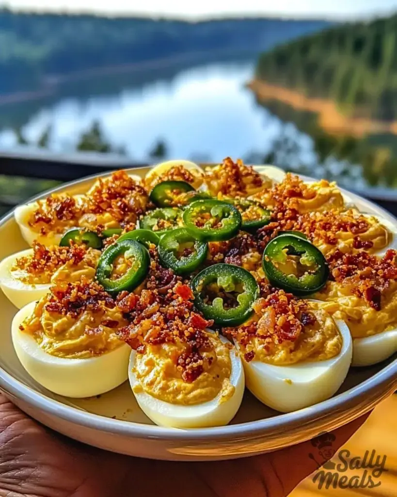 Jalapeño Popper Deviled Eggs are a spicy, creamy, and crunchy twist on the classic deviled egg recipe. Made with a rich yolk filling blended with cream cheese, mayonnaise, cheddar cheese, and fresh jalapeños, these deviled eggs are topped with crispy turkey bacon and extra jalapeño slices for the perfect bite. Whether for a party, holiday gathering, or snack, they are a must-try for jalapeño lovers!