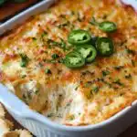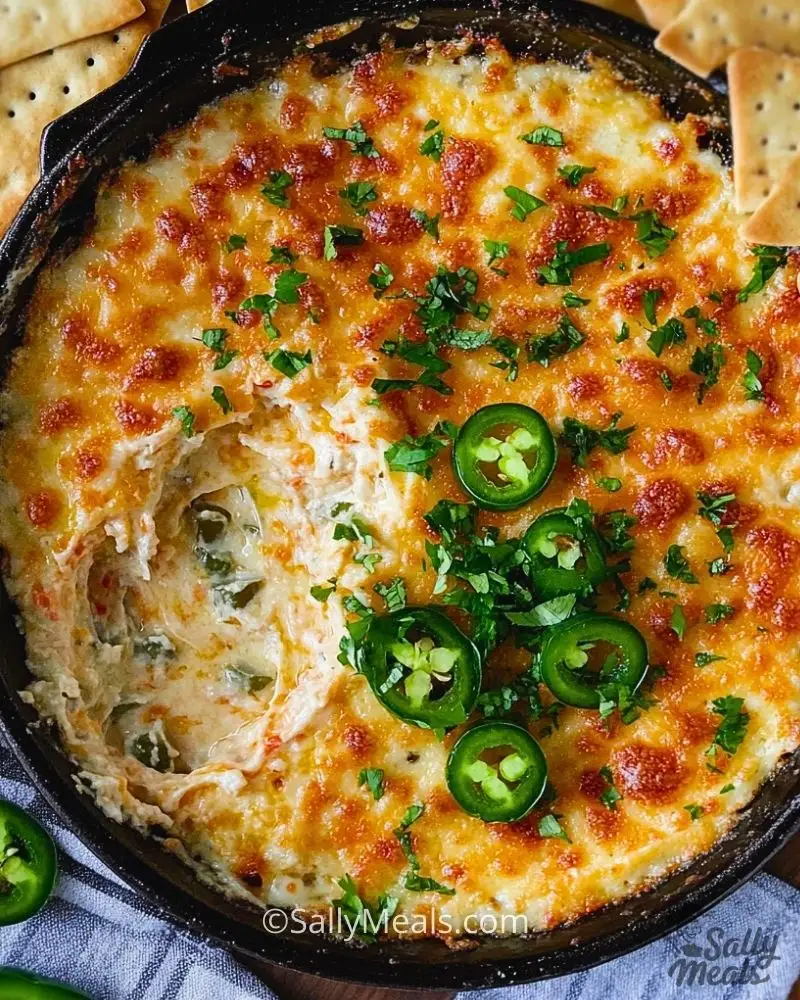 Once out of the oven, garnish the dip with additional chives and sliced jalapeños for a fresh, colorful touch. Serve immediately with crackers, tortilla chips, or vegetable sticks for dipping. Enjoy!