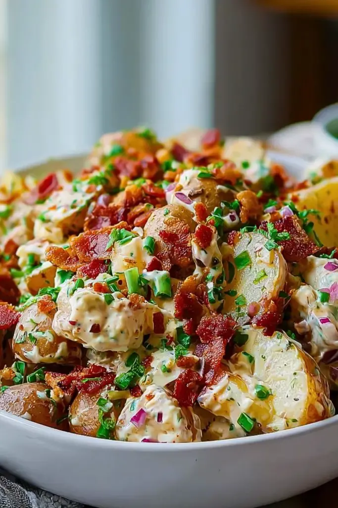 If you're making it ahead for an event, prep the potatoes, dressing, and bacon separately the night before. Mix everything together the morning of for ultimate freshness.
