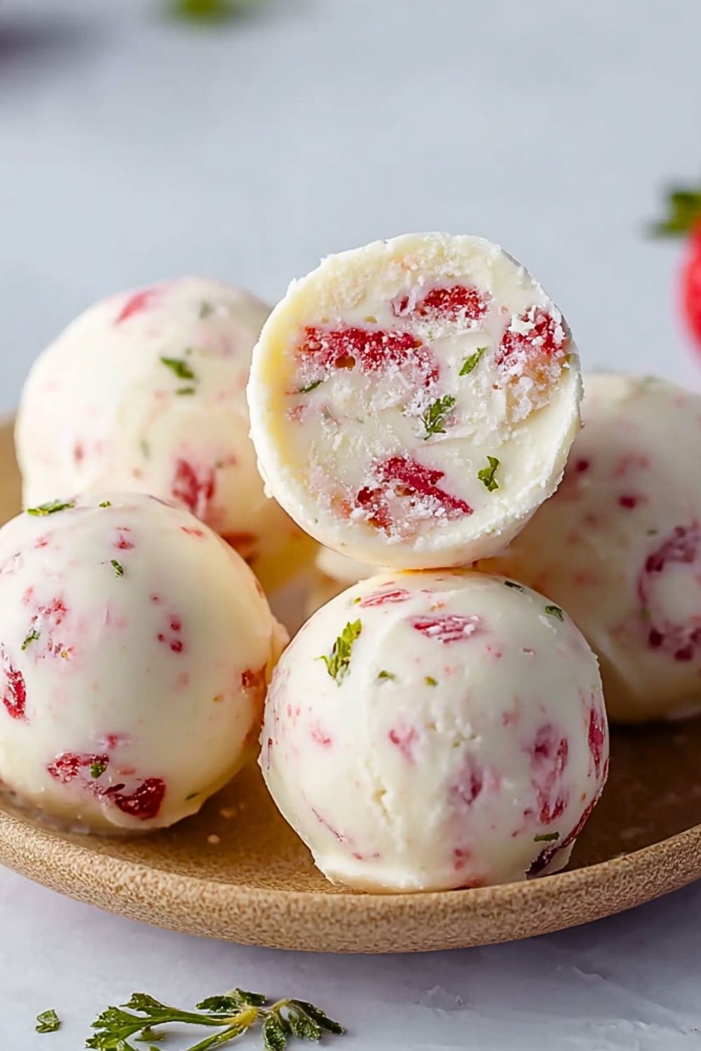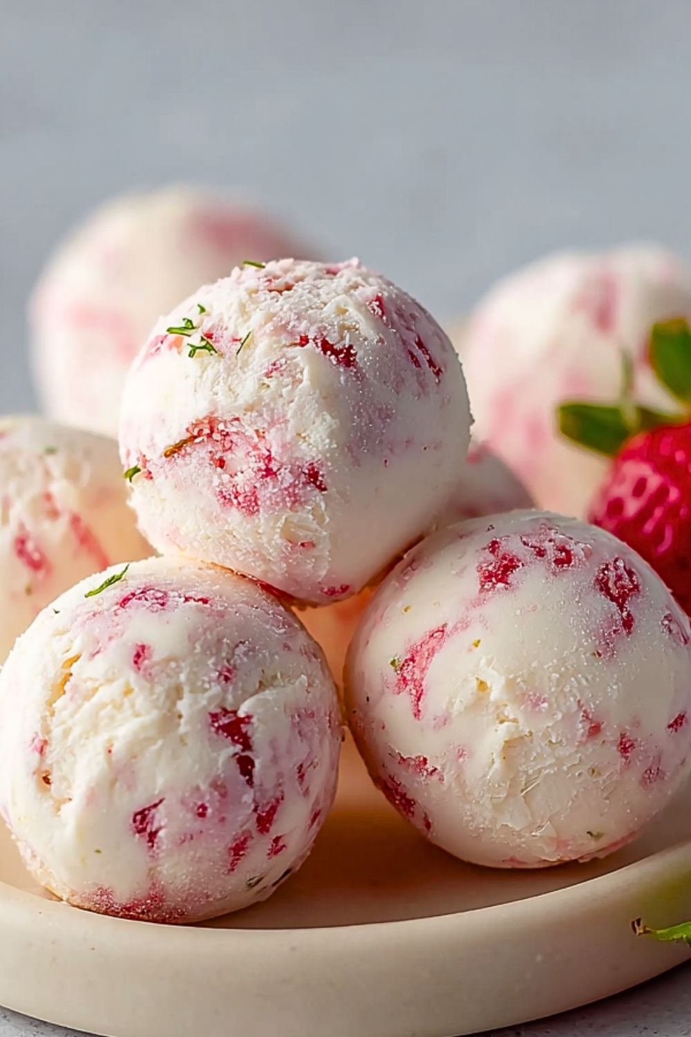 Use room-temperature cream cheese to avoid lumps when blending. Fresh strawberries give the best flavor, but you can use frozen (just thaw and pat dry first). Make sure not to over-blend the mixture—keeping a few strawberry chunks adds visual appeal and texture. If the mixture is too soft to scoop, refrigerate it for 10–15 minutes before shaping. For longer storage and firmer texture, freeze the fat bombs and take out only as needed.