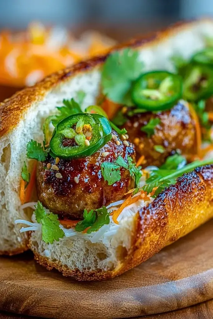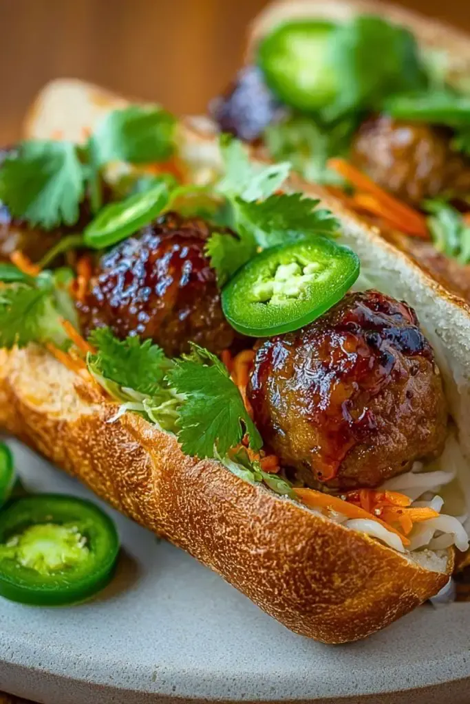 Slice the baguette lengthwise, leaving one side attached. Spread mayonnaise on the inside, layer in the pickled vegetables, then add the glazed meatballs. Top with fresh jalapeño slices and cilantro leaves.