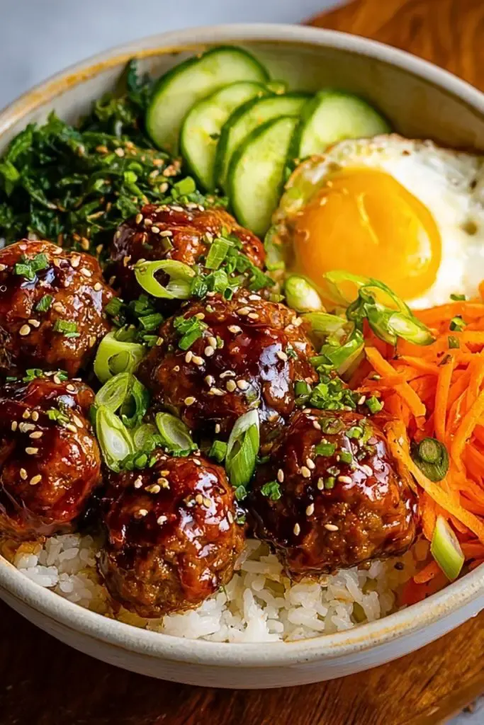 Start with a scoop of warm rice, then top with glazed meatballs, shredded carrots, cucumber slices, and a drizzle of spicy mayo. Sprinkle with sesame seeds and chopped green onions to finish.