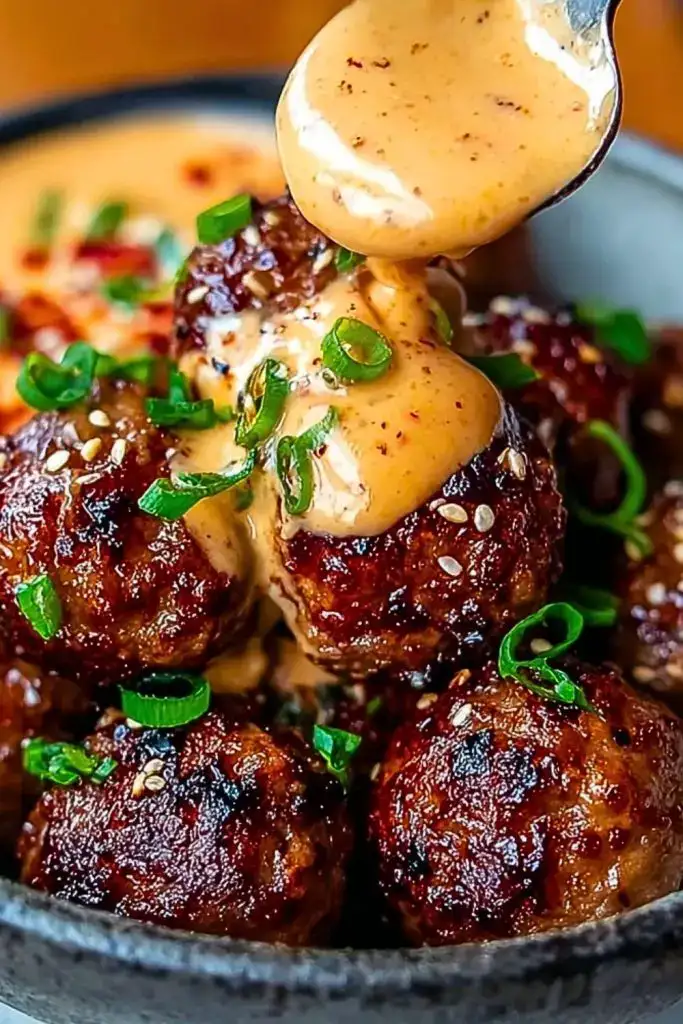 Reheat the meatballs in a 350°F oven or gently in the microwave. For best texture, avoid overcooking during reheating. Add fresh glaze or spicy mayo on top after.