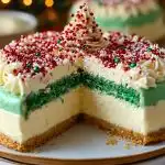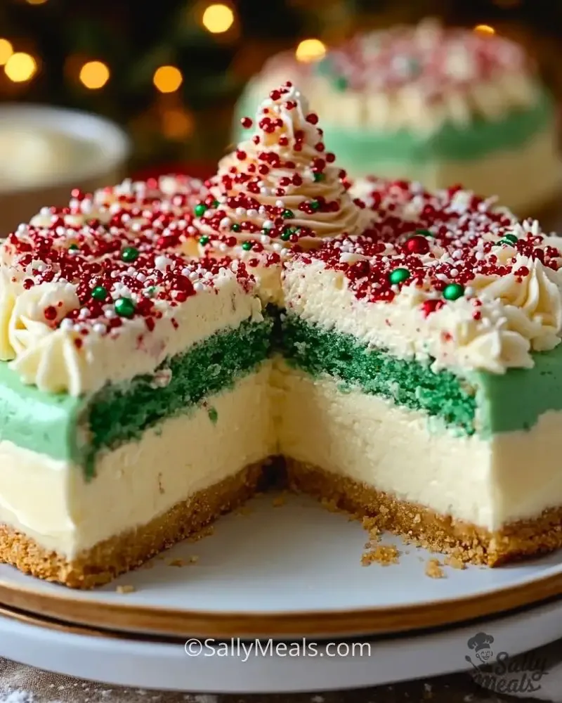 A festive holiday dessert inspired by the nostalgic Little Debbie snack cakes, this cheesecake features a buttery graham cracker crust, creamy vanilla cheesecake filling, vibrant green sponge cake layer, and a whimsical topping of red sugar pearls and powdered sugar. Perfect for Christmas parties, family gatherings, and holiday dessert tables.