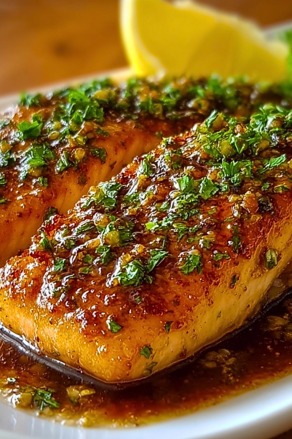 Remove the salmon from the oven and let it rest briefly. Spoon any remaining glaze from the baking dish over the top, then sprinkle with freshly chopped parsley. Serve immediately with your favorite sides.