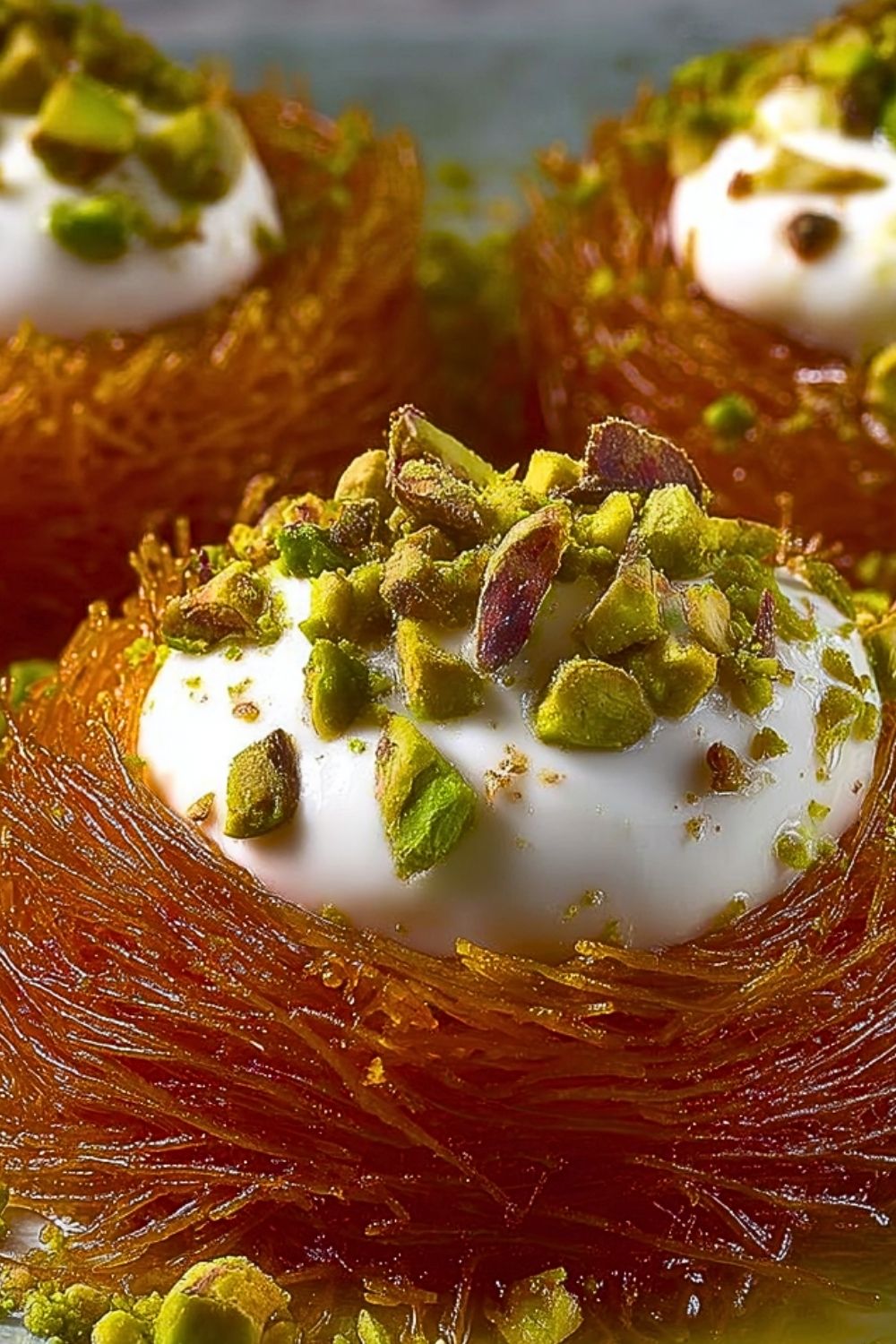 Top each nest with crushed pistachios. Serve fresh for the best texture and flavor, when the contrast between crispy kunafa and creamy filling is at its peak.