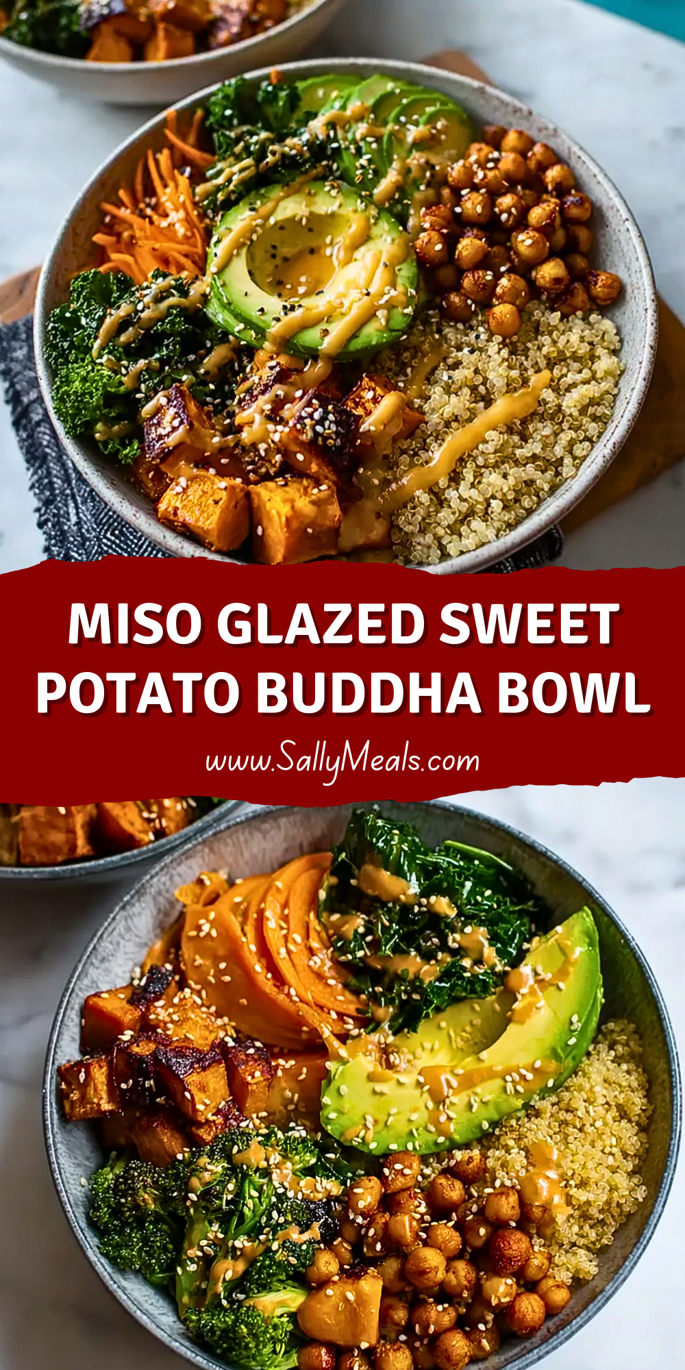 In each bowl, start with a base of quinoa. Add sections of miso-glazed sweet potatoes, roasted chickpeas, broccoli, shredded carrots, kale, and sliced avocado. Drizzle generously with the tahini sauce and sprinkle with sesame seeds.